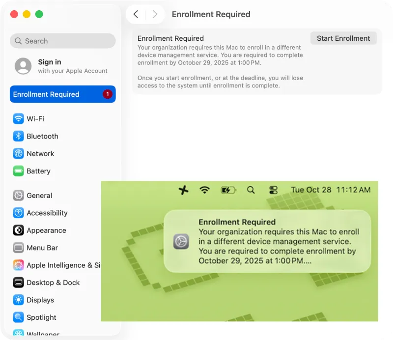 Shortly after migration initiates in AxM, the user will receive an 'enrollment required' notification, letting them know that an enrollment change is required and when it must be completed. They can either start the enrollment right away or defer it until the deadline.