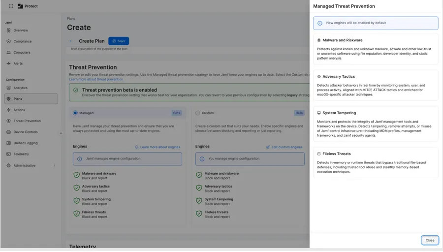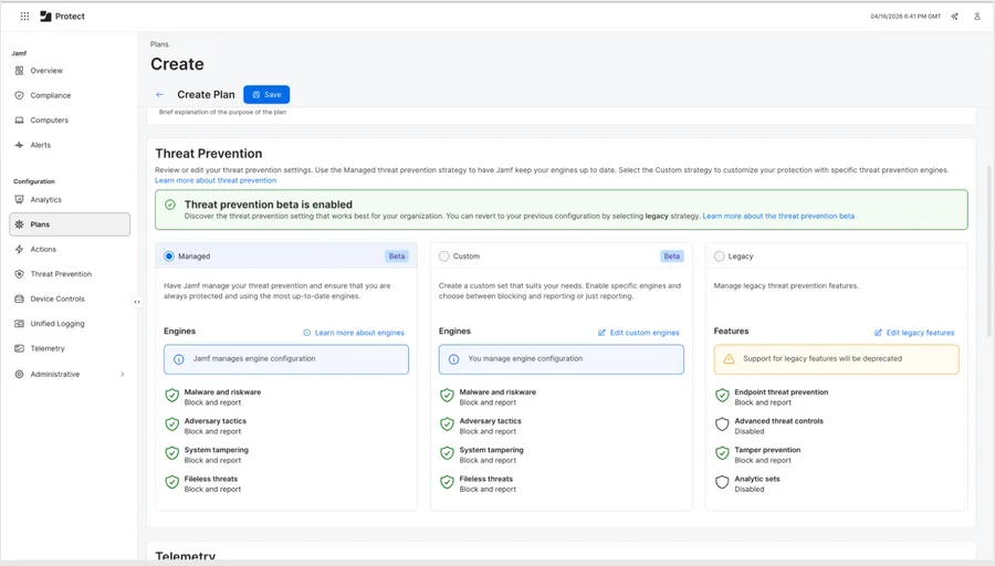 Mac threat prevention encompasses Analytics, Advanced Threat Controls, Threat Prevention, and Tamper Prevention, now all configurable from one screen. But the legacy capabilities will remain active during the beta. If your organization has Plans currently configured, they will remain active with the legacy strategy. By enabling the beta, your organization can test the redesigned threat prevention alongside your current strategies.
