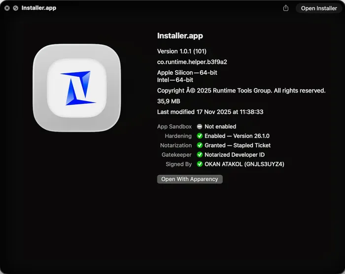After inspecting the Mach-O binary, which is a universal build, we confirmed that it is both code signed and notarized. The signature is associated with the Developer Team ID GNJLS3UYZ4.