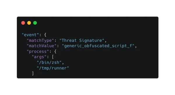 Looking at the matched event showed a shell script running at /tmp/runner which raised our suspicions.