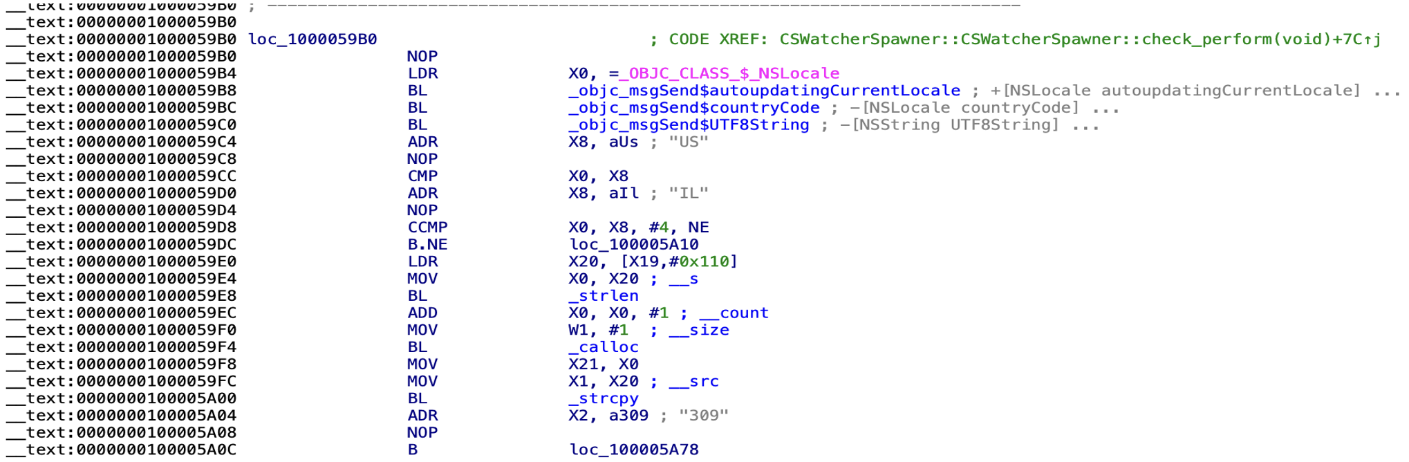 Figure 6: Geographic restriction check using NSLocale — comparing country code against "US" and "IL", triggering error 309