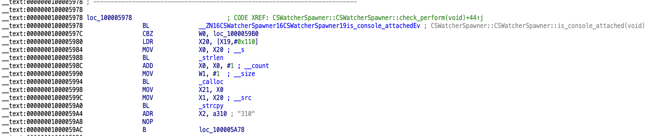 Figure 7: Debug console detection showing is_console_attached() call and error code 310 dispatch