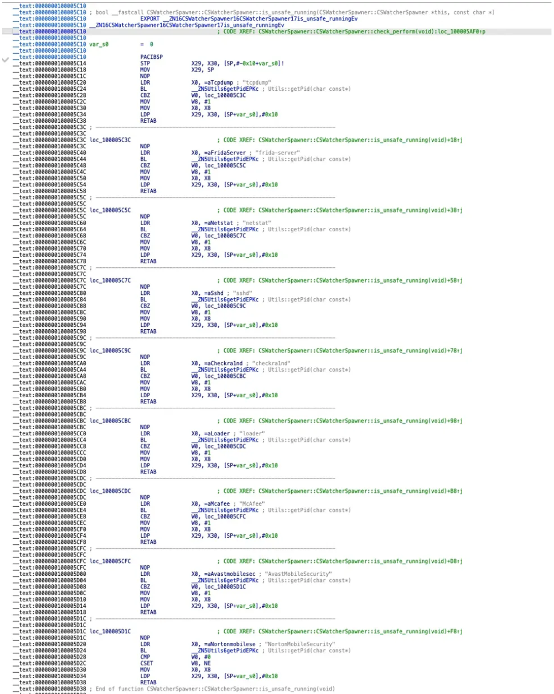 Figure 8: is_unsafe_running() assembly — complete process detection list including tcpdump, frida-server, netstat, sshd, checkra1nd, loader, McAfee, AvastMobileSecurity, NortonMobileSecurity