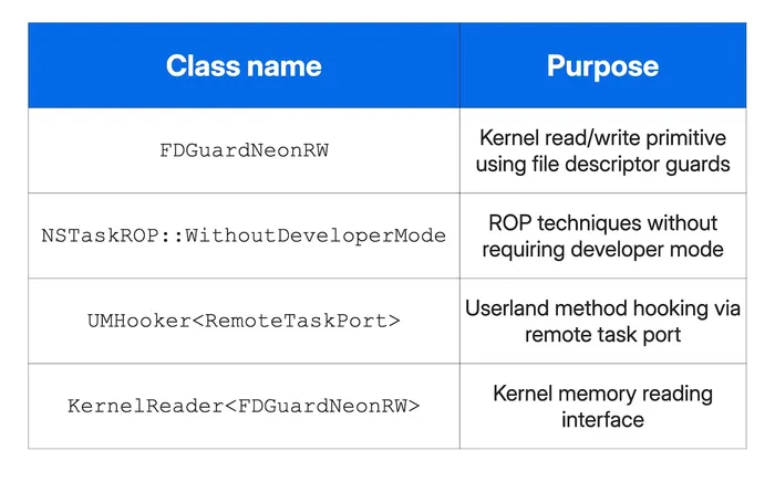 - Kernel exploitation class names that reveal the internal architecture