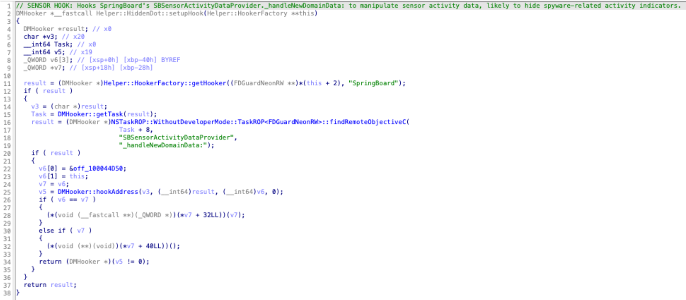 The HiddenDot::setupHook() function targets SpringBoard's sensor activity data provider: