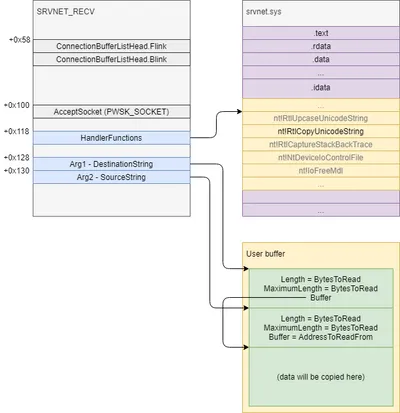Now all we had to do was to find a convenient function to copy memory from one location to another, so that we can copy arbitrary memory to the pool buffer we can read from. memcpy comes to mind, and srvnet.sys does have such a function (memmove, to be precise), but this function requires a third argument, the amount of bytes to be copied, which we don’t control. Failing to find a convenient function that requires one or two arguments, we realized that we’re not limited by functions implemented in srvnet.sys, we can also call functions from srvnet’s import table by pointing HandlerFunctions at the right offset. There, we found the perfect function: RtlCopyUnicodeString.