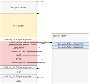 - ConnectionBufferList – A linked list of all of the received, unhandled buffers of a connection. The list head is a part of the connection object created by the SrvNetAllocateConnection function in srvnet.sys. A buffer is added to the list by the SrvNetWskReceiveComplete function. In our case, there will be only one buffer in the list, so both pointers (Flink and Blink of the LIST_ENTRY struct) will point to the list head inside the connection object.