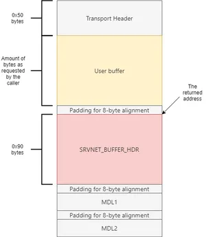 As we already mentioned in our local privilege escalation research, the SrvNetAllocateBuffer function doesn’t just return a buffer with the requested size. Instead, it returns a pointer to a struct that is located at the bottom of the pool-allocated memory block, containing information about the allocated buffer. The layout of the pool-allocated memory block is the following: