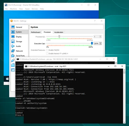 We tweaked the POC such that it sends several packets simultaneously from multiple threads to improve the logical processor usage distribution. We also added error detection, so that if the data that is read doesn’t make sense, another reading attempt is made instead of proceeding and most likely crashing the system. The changes we made were enough to make the POC work with VirtualBox targets with multiple logical processors, but from a quick test the POC doesn’t work with VMware targets or (at least some) physical computers with multiple logical processors. We didn’t try to improve the POC further to support all targets, which we believe can be achieved with a better strategy for a reading and writing order.
