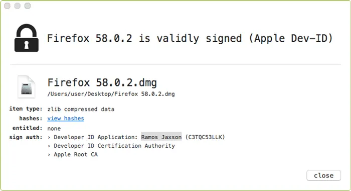 Thus, instead of the legitimate Firefox application, a trojanized version would be served up to the user in form of a signed disk image. Using Objective-See’s WhatsYourSign utility, we can see that though the disk image (.dmg) is signed, it’s signed with a random developer ID (Ramos Jaxson):