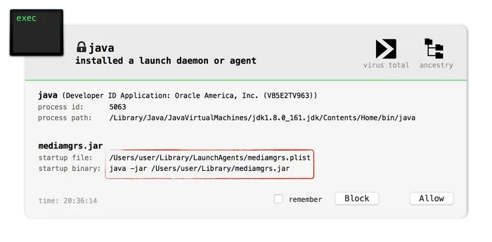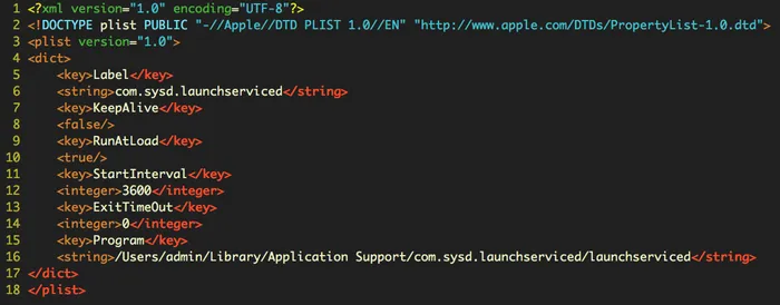 $ cat ~/Library/LaunchAgents/mediamgrs.plist Label mediamgrs ProgramArguments java -jar /Users/user/Library/mediamgrs.jar RunAtLoad