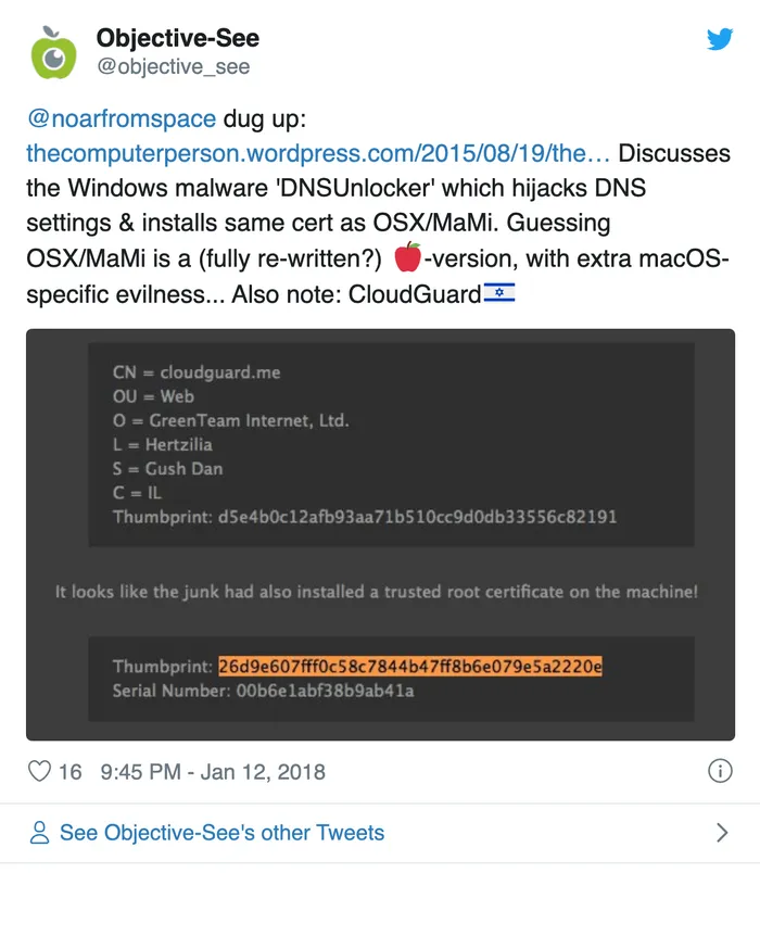 One last point of interest, it’s possible that OSX.MaMi is a (fully re-written?) macOS version of the Windows malware Win32.DNSUnlocker: