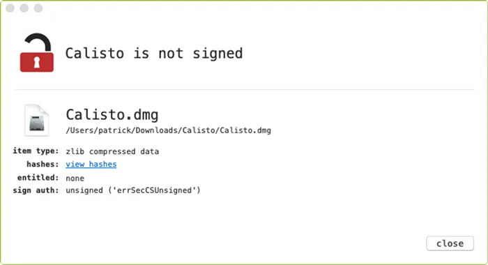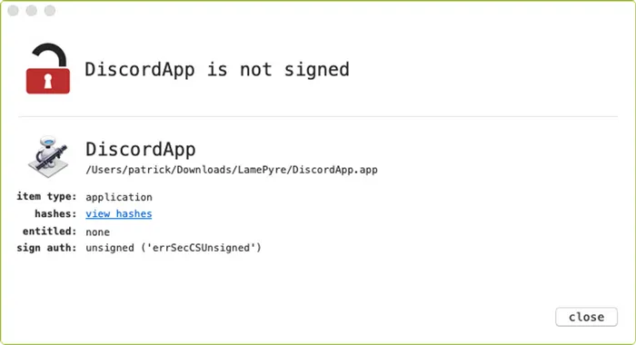Note though, the by using Objective-See’s WhatsYourSign utility, we can see that LamePyre is unsigned: