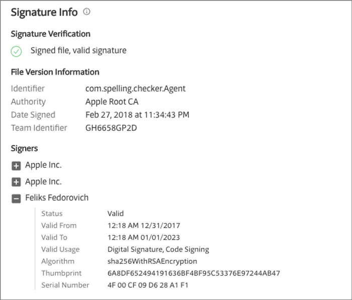 What is known is that FairyTail was distributed as an application named SpellingChecker.app. Also, as this application (like most Mac malware/adware these days) was signed, Apple’s GateKeeper would not have blocked it’s execution if users were tricked or coerced into downloading the malicious code: