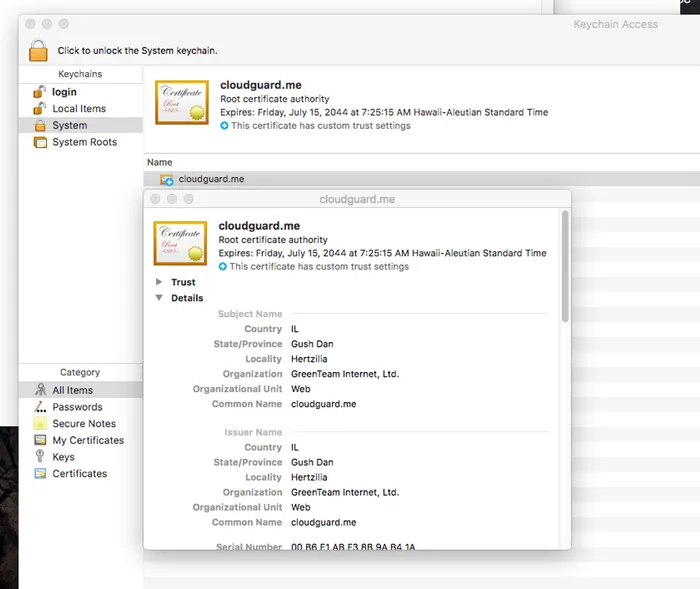 Before the DNS hijacking, the malware installs a malicious certificate in the System Keychain: