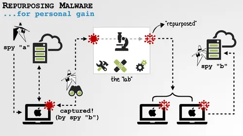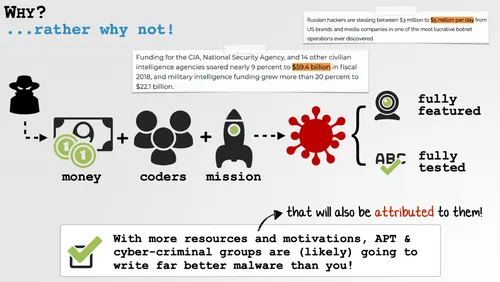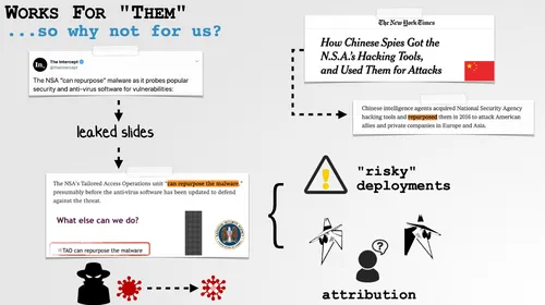 The talk also covered the many benefits of repurposing others' malware; benefits that basically boil down to the fact that various well-funded groups and agencies are creating fully-featured malware, so why not leverage their hard work ...in a way, that if discovered, will likely be (mis)attribute back to them?