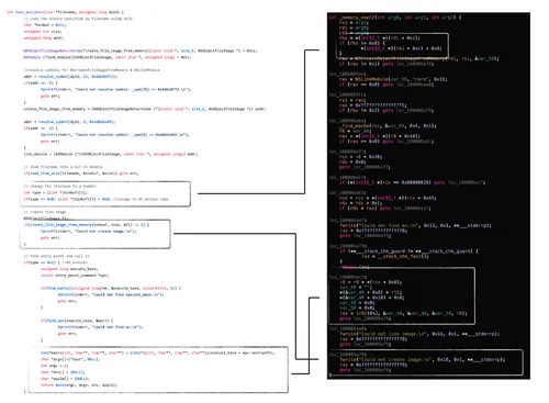 - Once the find_macho method returns, the malware begins parsing the mapped/linked (mach-O) payload, looking for the address of LC_MAIN load command (0x80000028), which contains information such as the entry point of the in-memory code.