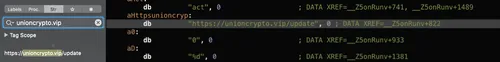 Looking in the disassembler, we find the hardcoded address of the malware C&C server: https://unioncrypto.vip/update: