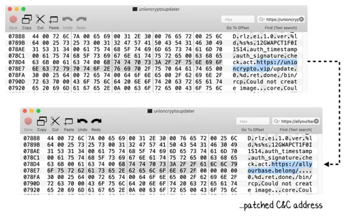 Popping into a hexeditor, we can modify this to whatever URL or IP address we'd like the malware to now connect to (i.e. to from https://unioncrypto.vip/update to https://allyourbase.belong/):