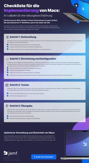 Die Einrichtung und Absicherung von Macs für ein wachsendes Team muss kein Kopfzerbrechen bereiten, selbst wenn Ihre IT-Abteilung schlank aufgestellt ist. Mit der richtigen Vorbereitung können Sie die Einführung vom ersten Tag an rationalisieren. Unsere Infografik unterteilt den Prozess in einfache, umsetzbare Schritte, die Ihnen helfen, Ihre Geräte einzurichten, zu sichern und vertrauensvoll zu übergeben. Ganz gleich, ob Sie Ihr MDM wechseln, Hardware aktualisieren oder neue Mitarbeiter:innen einstellen - mit dieser Ressource machen Sie alles richtig.