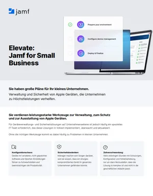 Laden Sie die Broschüre herunter und erfahren Sie, wie Sie mit Jamf in 60 Minuten eine einheitliche Verwaltung und Sicherheit Ihrer Geräte erreichen.