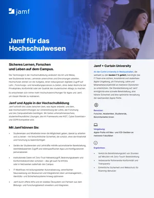 Erfahren Sie, wie Jamf den Einsatz von Apple Technologie an Hochschulen optimiert: von der Bereitstellung und Sicherheit bis hin zur Verwaltung für Studierende, Lehrkräfte, Forschungspersonal und die IT-Teams.