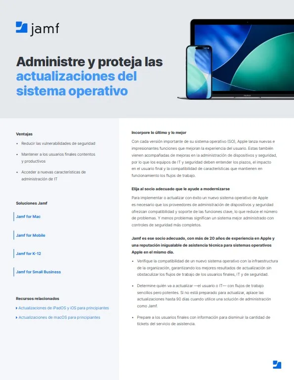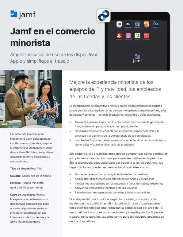 Transforme la forma de trabajar de los empleados maximizando lo que pueden hacer sus dispositivos móviles Apple. Con Jamf for Mobile, las organizaciones pueden: Administrar y proteger su flota móvil con una plataforma diseñada por Apple. Mantener la seguridad del dispositivo para diversas necesidades móviles sin comprometer la experiencia del usuario. Simplificar los flujos de trabajo de los trabajadores sin escritorio y de los dispositivos compartidos para casos de uso de dispositivos móviles. Descargue el folleto para descubrir las capacidades de Jamf for Mobile.