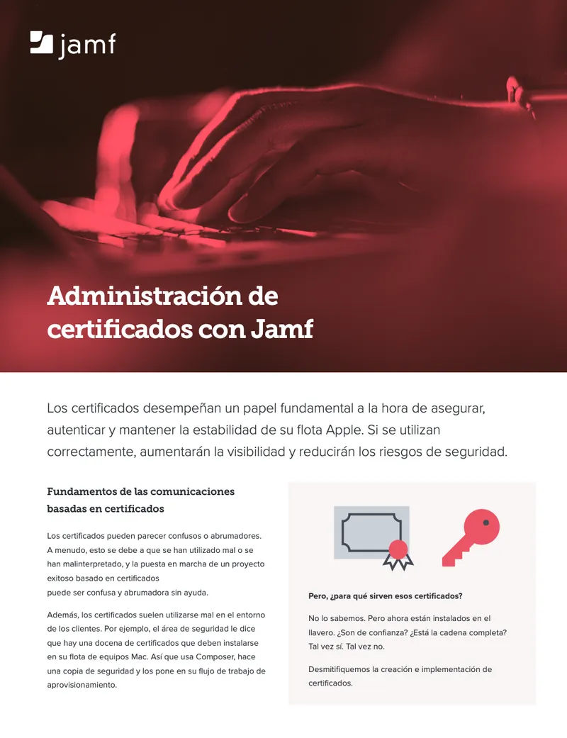 Los certificados desempeñan un papel fundamental a la hora de asegurar, autenticar y mantener la estabilidad de su flota Apple. Pero a veces pueden ser confusos, y demasiadas organizaciones los utilizan mal. Esta guía, que contiene flujos de trabajo, definiciones y discusiones detalladas sobre las autoridades de certificación y el Proxy (SCEP) y el Conector ADCS, ayuda a aclarar las cosas. Esta guía, basada en el webinar "Administración de certificados con Jamf", le ayudará a aprender: Los fundamentos de las comunicaciones basadas en certificados Cómo utiliza Jamf los certificados Cómo utilizar los certificados usted mismo La implementación de certificados con Jamf Cómo crear certificados Cómo funciona el proxy de certificados Jamf
