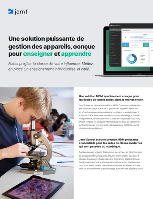 Jamf School est une solution de gestion des appareils mobiles (ou MDM) développée sur mesure pour le secteur de l’éducation. Grâce à son interface web intuitive, il n’a jamais été aussi simple de déployer des Mac, iPad et Apple TV, de gérer leur inventaire et de les sécuriser. Apple offre la meilleure technologie d’apprentissage. Jamf School simplifie considérablement le déploiement et la gestion des appareils Apple pour que vous puissiez vous consacrer à enseigner.