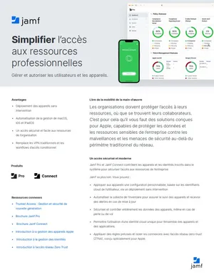 Les organisations doivent protéger l’accès à leurs ressources, où que se trouvent leurs collaborateurs. C’est pour cela qu’il vous faut des solutions conçues pour Apple, capables de protéger les données et les ressources sensibles de l’entreprise contre les malveillances et les menaces de sécurité au-delà du périmètre traditionnel du réseau. Jamf Pro et Jamf Connect contrôlent les appareils et les identités inscrits dans le système pour sécuriser l’accès aux ressources de l’entreprise.