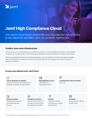 Destiné aux organisations des secteurs hautement réglementés, Jamf High Compliance Cloud permet de gérer les appareils Apple en toute sécurité, en respectant les normes de conformité les plus strictes en vigueur dans la santé, la finance et le commerce international.