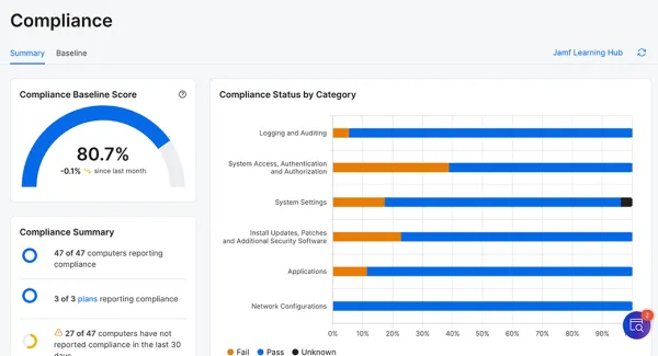 CISベンチマークなどの基準に基づき、Macの設定状態を⾃動評価。
