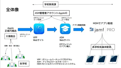 Appleの正規代理店と連携して見積や発注、銀行振込からApple School Managerでの購入、そしてJamf Proでの配信までをスムースに行える仕組みを構築することで、特定の学校だけで必要なアプリもスムースに導入可能にしています。