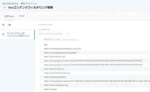 Webフィルタリングには、Jamf ProのWebコンテンツフィルタにURLを登録し、 それを構成プロファイルとして配付することで制御を行っています。