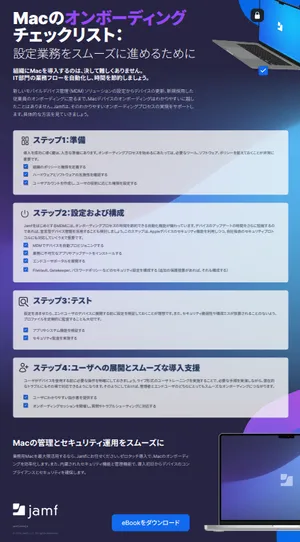インフォグラフィックをダウンロードして、Macのオンボーディングプロセスの効率化にお役立てください。