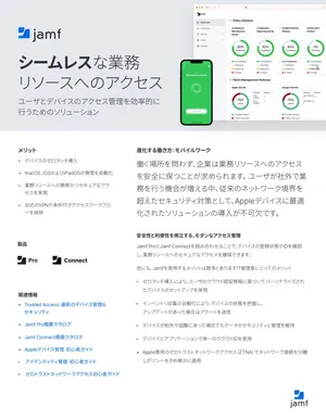 働く場所を問わず、企業は業務リソースへのアクセスを安全に保つことが求められます。 ユーザが社外で業務を行う機会が増える中、従来のネットワーク境界を超えたセキュリティ対策として、Appleデバイスに最適化されたソリューションの導入が不可欠です。 Jamf ProとJamf Connectを組み合わせることで、デバイスの登録状態やIDを確認し、業務リソースへのセキュアなアクセスを確保できます。