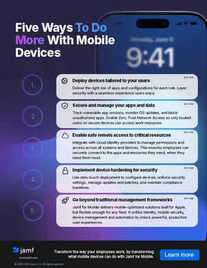 Mobile devices are powerful tools to boost productivity wherever users work. Jamf helps organizations secure their mobile workforce and realize digital transformation.