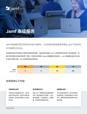 凭借多年积累的 Apple 部署最佳实践经验,Jamf 高级服务提供专业技术支持与额外资源,助力您高效推进关键项目。