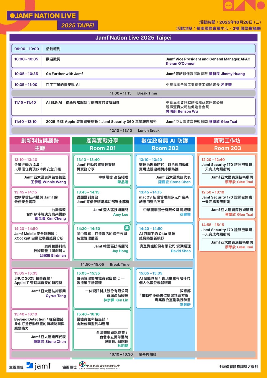 今年 Jamf Nation Live Taipei 將聚焦於「放大 Apple 裝置的價值」、「零信任安全與 AI」以及「合規自動化」三大主題。我們將帶來最新的產業洞察與成功案例,協助組織因應資安挑戰、提升管理效率,並充分發揮 Apple 生態系的優勢。