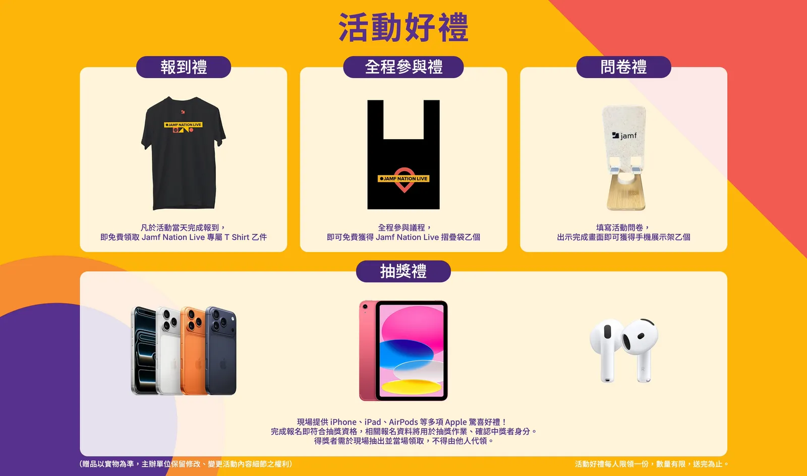 我們非常歡迎您的加入!在活動現場,無論您是想認識最新的解決方案,還是希望與 Jamf 專家互動,我們的團隊都將隨時在場,提供您所需的協助與支援。