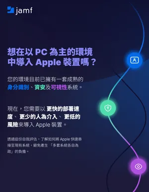 現在,您需要以更快的部署速度 、更少的人為介入、更低的風險來將 Apple 裝置整合至現有架構中。