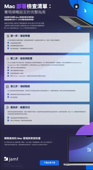 即使 IT 人手有限,在大規模配置與保護 Mac 裝置時,也不該讓您感到焦頭爛額。只要事前準備周全,從第一天起就能實現自動化導入。這份圖解指南將流程拆解為可立即執行的步驟,助您高效完成裝置設定、防護與交付裝置。無論您是要更換 MDM 供應商、進行硬體汰換,還是執行新機導入,這份資源都能助您一次就做對。