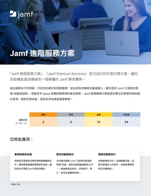 「Jamf 進階服務方案」(Jamf Premium Services)是可供客製化的年度訂閱方案,讓你的組織能直接與 Jamf 專業團隊合作,獲得最佳支援。