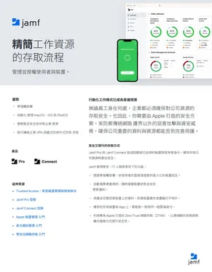 無論員工身在何處,企業都必須確保對公司資源的存取安全。這就是為什麼你需要由 Apple 打造的解決方案,來保護公司的敏感資料與資源,不受傳統網路邊界之外的惡意攻擊與安全威脅影響。Jamf Pro 與 Jamf Connect 能協助驗證已註冊的裝置與使用者身分,確保存取公司資源時更加安全。
